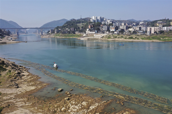 嘉陵江重慶市北碚區三勝廟段人工魚巢鋪設現場,護魚隊員在現場巡查并對破損魚巢進行及時修復(無人機照片)。秦廷富攝