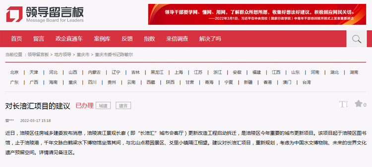 3月17日,網友“綦人123”留言稱,“近日,涪陵區住房和城鄉建設委員會發布消息,涪陵區今年重要的城市更新項目——涪陵濱江景觀長廊(即長涪匯城市會客廳)改造工程啟動拆遷。該項目起于涪陵區圖書館,止于涪陵港,千年文脈白鶴梁水下博物館坐落其間!睂Υ,網友建議對長涪匯項目重新規劃,考慮為中國水文博物院、未來的世界文化遺產預留空間。