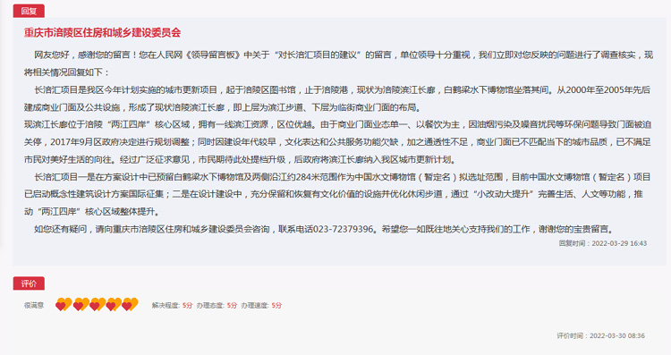 3月30日,網友“綦人123”對重慶市涪陵區住房和城鄉建設委員會的辦理回復給出了“五心”好評。