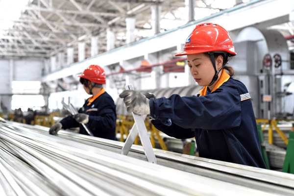 西南鋁擠壓員工在矯直鋁型材。西南鋁公司供圖