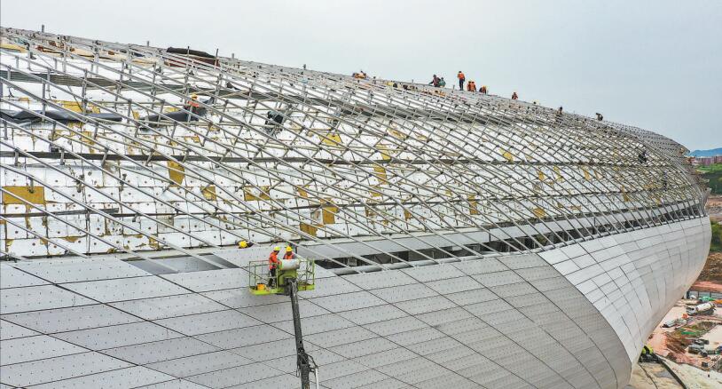 3月29日,施工人員在重慶龍興足球場進行幕墻和屋面施工。龍興足球場位于重慶兩江新區龍盛片區,是重慶市打造的首座超大型專業足球場,建成后可容納約6萬人觀賽。目前,工程已進入金屬屋面及幕墻裝飾裝修施工收尾階段。