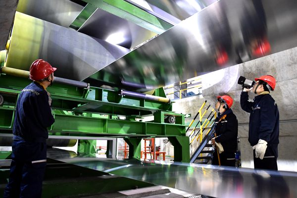 中鋁高端制造西南鋁熱處理員工在檢查鋁合金板材下表面質量。中鋁高端制造供圖