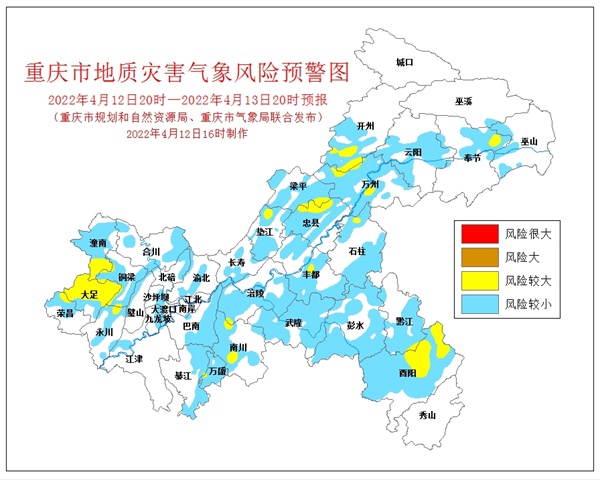 4月12日16時,重慶市規劃和自然資源局、重慶市氣象局聯合發布全市地質災害氣象風險預警。