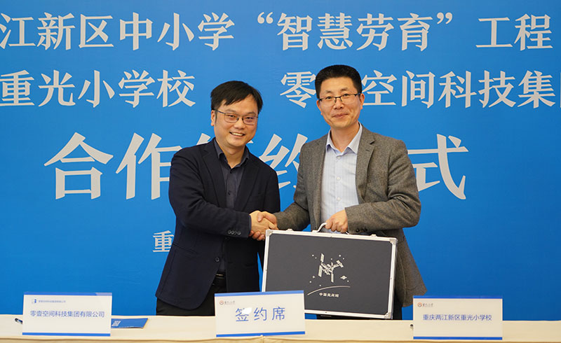 活動中,重光小學校長李斌、重慶零壹空間副總裁陳江瀾簽署結對合作協議,重慶零壹空間贈予重光小學太空空間站模型。