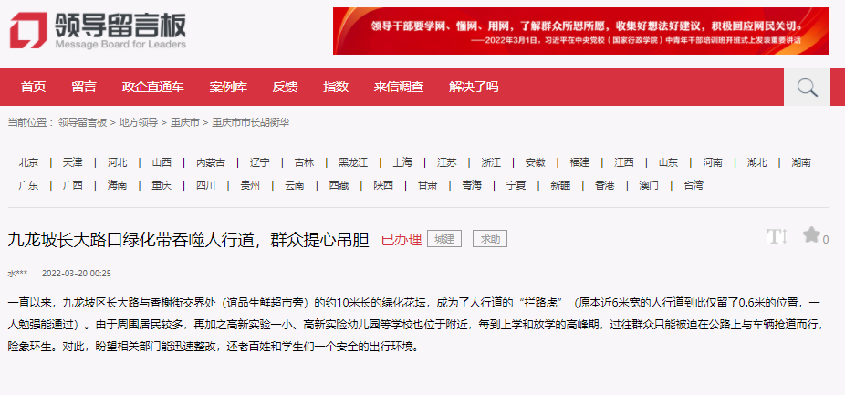 九龍坡區渝州路街道回復。人民網領導留言板截圖