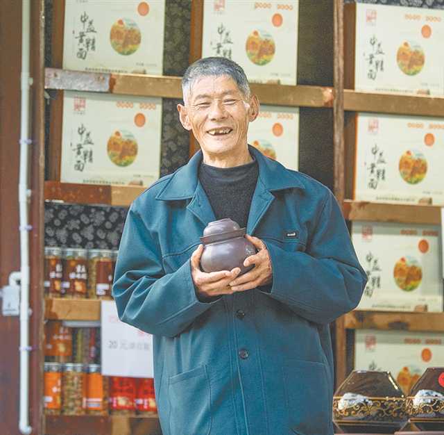 堂屋里,擺滿了壇壇罐罐,大的小的都有。這些罐子里裝的就是連心小店的主打商品——土家酸渣肉。原來,中益鄉發展研學游后,每天都有很多游客上門,為譚登周帶來了新的增收門路。村里動員他用柴房入股,由村集體投資改造成連心小店,引進企業制作酸渣肉、油團子粑粑、臘肉等當地特色美食,譚登周、企業和村集體按5∶4∶1的比例分紅,讓老兩口增加收入。