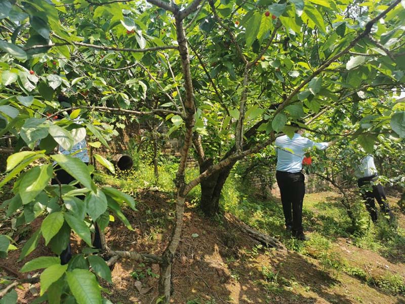 民生銀行重慶巴南支行員工為農戶搶摘櫻桃。民生銀行重慶分行供圖