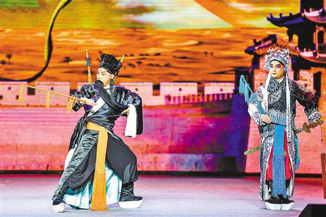 張軍強帶著重慶京劇院的演員以及他的學生,依次帶來了《秦瓊觀陣》《八仙過!贰吨楹熣返榷鄠經典傳統戲選段,給現場觀眾帶來許多感動與回憶。他本人更是先唱老生“李克用”,再扮《大足》“趙智鳳”,一人分飾多角,唱念做打,渾身是戲,贏得滿堂彩。