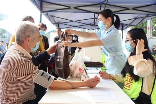 “嬢孃,你這個血壓有點高哦,平時還是要多注意一下?!薄澳阌羞@種情況的話說明可能有胃炎了,最好后面去醫院檢查一下?!被顒蝇F場,工作人員仔細回答市民們的健康咨詢。
