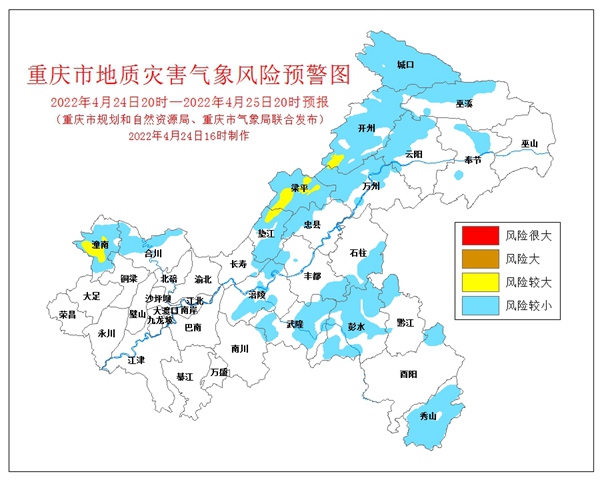 4月24日16時,重慶市規劃和自然資源局、重慶市氣象局聯合發布全市地質災害氣象風險預警。