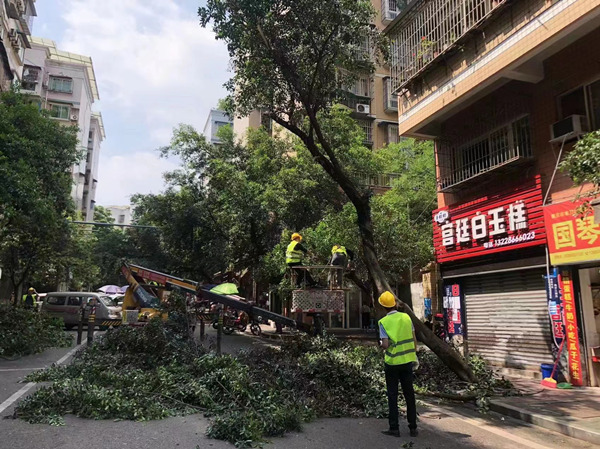 由于修枝涉及的區域較大,為保證施工安全,在工程開展的前一個星期,回興街道金凱路社區對該區域的居民發了告知通知;街道協調了回興交巡警大隊對支路的車輛進行了規范,對亂停亂放的車輛進行勸離;邀請渝北區經信委、區城管局的專業人士前往現場進行修枝技術指導。