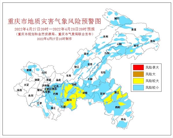 4月27日16時,重慶市規劃和自然資源局、重慶市氣象局聯合發布全市地質災害氣象風險預警。