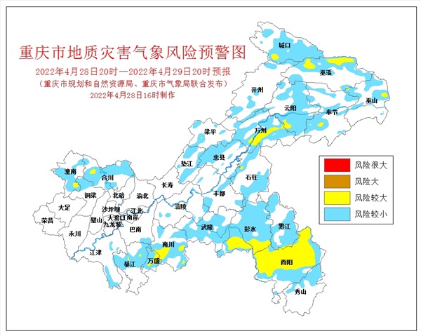 4月28日16時,重慶市規劃和自然資源局、重慶市氣象局聯合發布全市地質災害氣象風險預警。