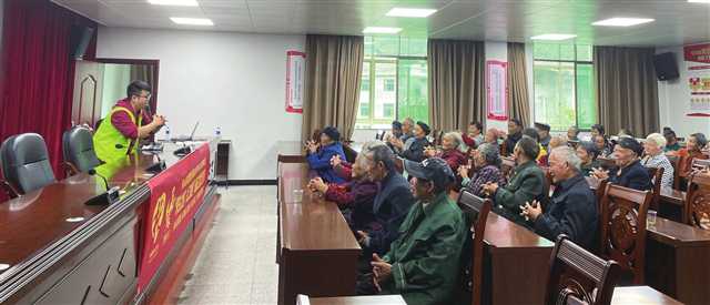 孟曉軻在健康主題社區活動中帶領老人們學習養生手指操