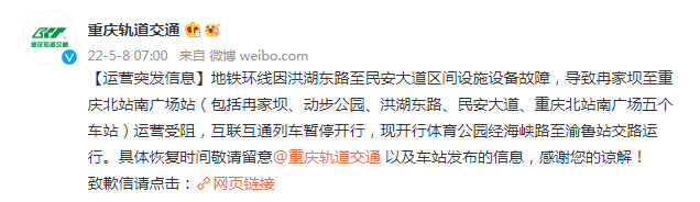 今(8)日,上游新聞從@重慶軌道交通獲悉,地鐵環線因洪湖東路至民安大道區間設施設備故障,導致冉家壩至重慶北站南廣場站(包括冉家壩、動步公園、洪湖東路、民安大道、重慶北站南廣場五個車站)運營受阻,互聯互通列車暫停開行,現開行體育公園經海峽路至渝魯站交路運行。具體恢復時間敬請留意@重慶軌道交通 以及車站發布的信息,感謝您的諒解!