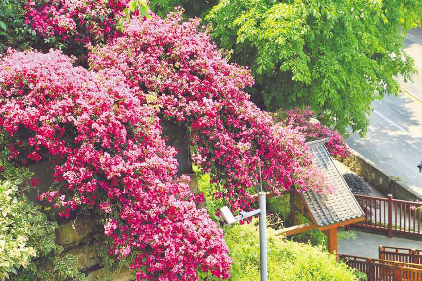 “同樣規模和形態的三角梅,在重慶觀賞可能會有更好的效果!绷温斎f,三角梅在山城有了更加立體的“舞臺”。首先,山城的地形比較豐富,容易形成小氣候環境,有助于三角梅生長。同時,山城的街頭路邊、公園、山城步道、立交橋兩側、坡坎崖、燈桿、建筑物外立面等諸多場景,都是三角梅的展示“舞臺”,市民的觀賞角度和范圍都更加豐富。