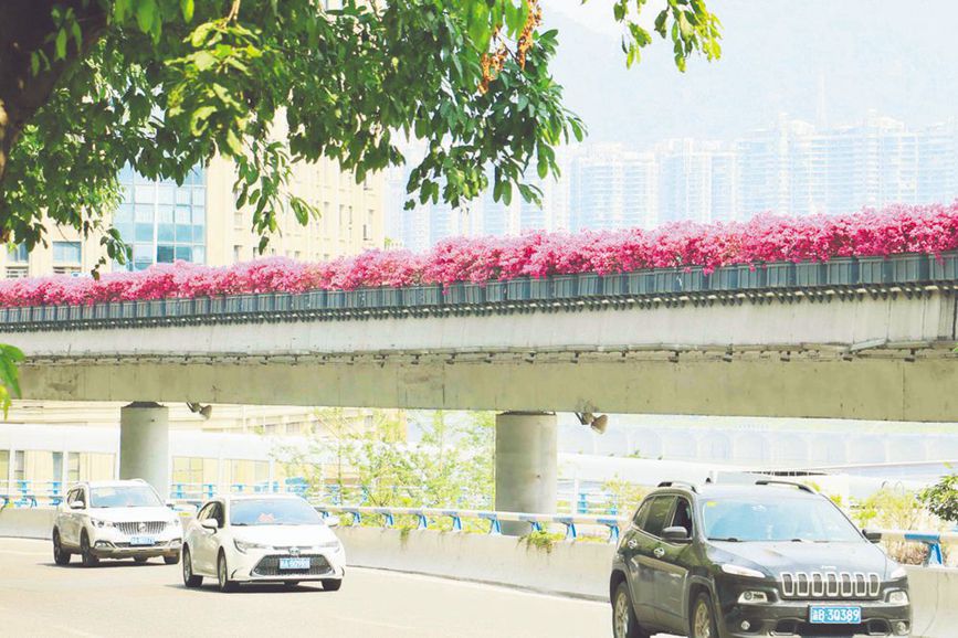 5月8日,記者在渝中區南區路、江北區北濱路、兩江新區金渝大道等地看到,在這些地方種植多年的三角梅,都要比往年開得更加繁密、嬌艷。