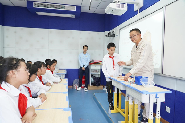 在志愿者與留守兒童的互動環節,國家電網公司勞動模范、2022年重慶五一勞動獎章獲得者項波為孩子們帶來了“電磁小火車”“手搖發電機”等生動有趣的電力小實驗,講解電的由來和相關知識。