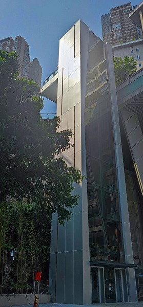 該電梯作為曾家巖大橋功能提升的重要組成部分,由兩臺無機房電梯組成,外裝飾為玻璃及鋁板,整體漂亮、大氣。投用后,市民可從江北區北濱路春森彼岸段乘坐垂直升降梯,經曾家巖大橋、曾家巖南橋頭步道,直接到達渝中區中山四路,有效提升了曾家巖大橋的步行環境。同時,也方便大家步行前往曾家巖大橋南橋頭廣場游玩拍照,將嘉陵江、曾家巖大橋盡收眼底。