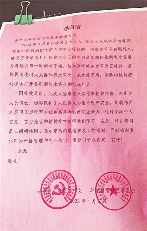看著火災撲滅,胡朝偉悄然離開了現場。次日,該小區的物業經過多番打聽,才得知了胡朝偉的工作單位和聯系方式,并向他所在單位送去了感謝信!白鳛橐幻h員、一名退伍軍人、一名單位的消防教員,這是我應該做的!笨吹礁兄x信后,胡朝偉平淡地說。(楊薈琳)