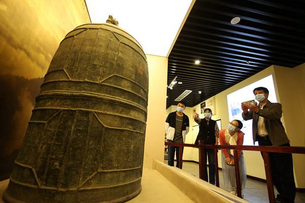 市民在參觀國家一級文物土家族唐鐘。楊敏攝