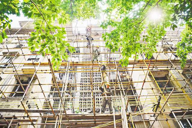 5月7日,巴南區李家沱街道渝紗社區,實施老舊小區改造的工人正在傳遞建筑材料。