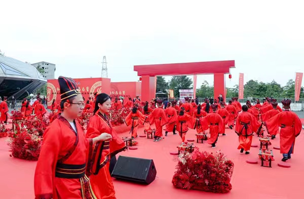 活動當天,在“禮官”的帶領下,新人們步履優雅而端莊的進入典禮現場,成為自然風景中一道最靚麗的風景線。暖堂頌詞、擊鼓鳴鐘、拜四方……整個婚禮慶典仿照漢式集體流程進行,“全國文明家庭”黃氏后人現場見證,祝福新人愛情美滿、生活幸福。