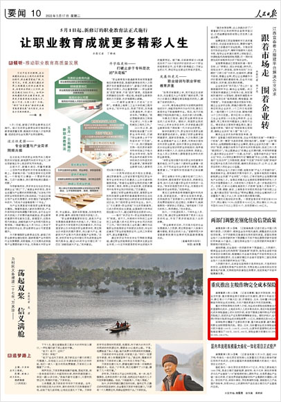 本報重慶5月16日電。ㄓ浾咄跣缾偅┲貞c市財政局、市農業農村委、重慶銀保監局日前聯合印發通知,要求今年起在萬州、黔江等27個產糧大區(縣)開展稻谷、玉米、馬鈴薯3種主要糧食作物完全成本保險,為農戶提供更高水平的風險保障。