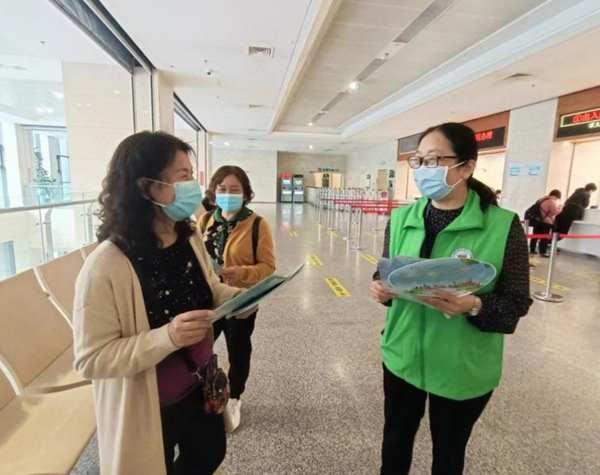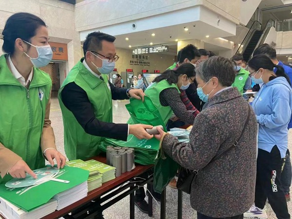 “阿姨,給您一份生活垃圾分類宣傳單,咱們平時在家里的生活垃圾應該怎么分類,往哪里扔,都寫得很清楚,您可以了解一下,再分類扔垃圾?!爆F場,志愿者們通過為群眾講解生活垃圾分類知識、發放生活垃圾分類宣傳資料、節水妙招小扇子、環保袋、可降解其他垃圾塑料袋、節約糧食宣傳單等引導患者及其家屬建立良好的生活垃圾分類、節約用水等好習慣,愛護生態環境,保護“地球母親”。