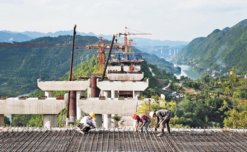 5月23日,中鐵十一局工人在黔江區過境高速公路阿蓬江特大橋上施工。