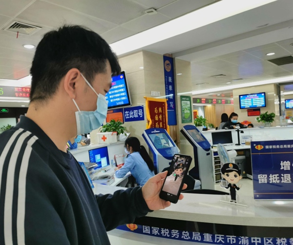在渝中區辦稅服務廳內,納稅人用手機掃描稅務卡通人物擺件上的二維碼,反映涉稅需求。王清青攝