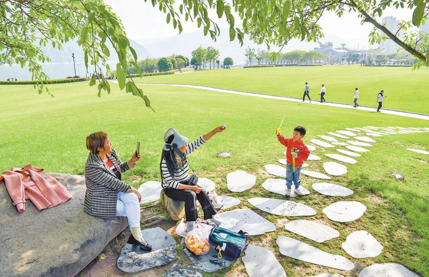 4月20日,云陽縣環湖綠道月光草坪,市民帶著孩子享受休閑時光。環湖綠道沿線老舊小區改造惠及11307戶居民。記者 謝智強 攝/視覺重慶