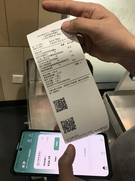 在永輝超市城市生活廣場店自助結賬柜臺,李先生使用數字人民幣錢包支付。張睿攝
