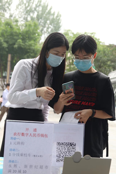農行工作人員向學生現場講解指導如何下載、使用數字人民幣。張睿攝
