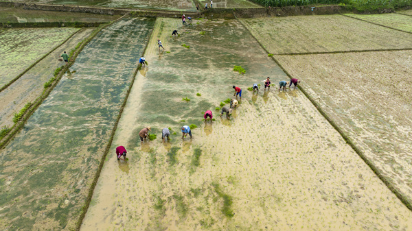 6月6日是芒種,是一年當中最繁忙的節氣之一。連日來,重慶豐都縣包鸞鎮田間地頭,處處可見村民們搶抓時節忙插秧的身影,一塊塊稻田插滿了嫩綠的秧苗,繪就出一幅賞心悅目的夏耕夏種圖。