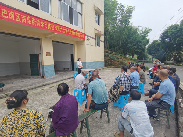 6月8日,在巴南區南泉街道新式村的農家院壩內,村黨總支書記張麗娟正在為村民們宣講市第六次黨代會精神,村民們也常聊起近五年來,自己家和鄉村環境發生的美麗變化。而這樣的院壩會,正以靈活多樣的形式在南泉街道的田間地頭、工廠車間、村會議室等地舉行,干部群眾們充滿了奮進新時代的干勁和信心。