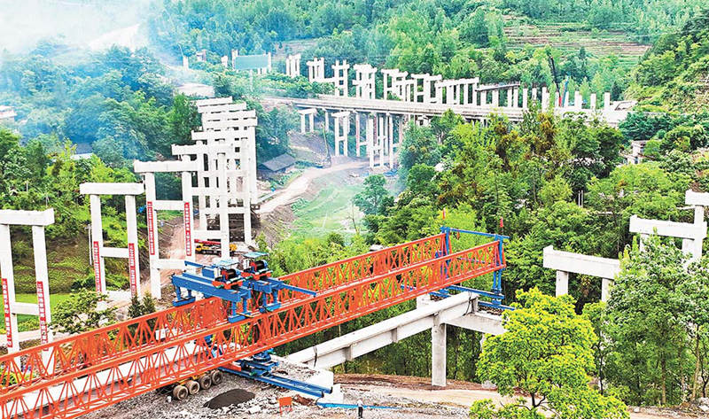 6月12日,渝湘高速擴能項目酉彭段銅西互通,部分橋墩開始架設預制梁。