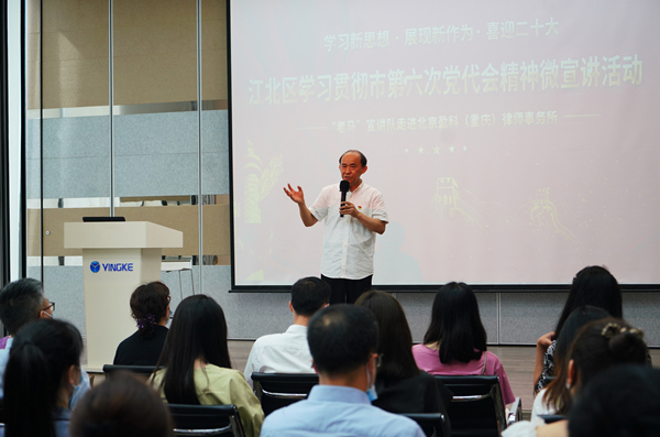 當日上午,在位于江北嘴的北京盈科(重慶)律師事務所內,“學習新思想 展現新作為 喜迎二十大 江北區學習貫徹市第六次黨代會精神‘老馬’宣講隊走進北京盈科(重慶)律師事務所”微宣講活動正熱烈開展。