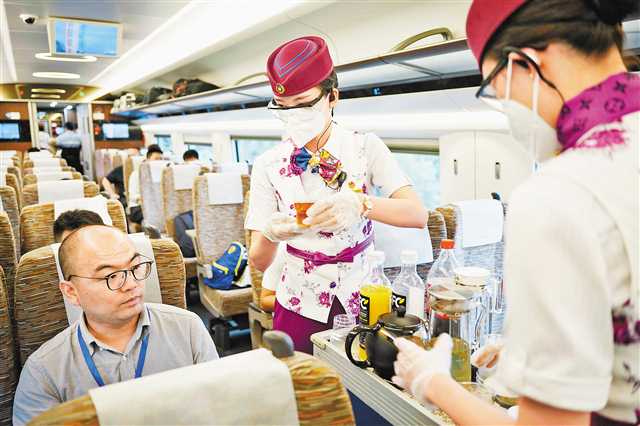 鄭渝高鐵重慶段,重慶北至巫山的試運行列車上,乘務員正在為旅客服務。(攝于6月13日)記者 謝智強 攝/視覺重慶