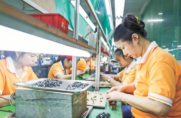 6月14日,華鎣山經開區內的廣安領創華財電子科技有限公司員工在加緊生產電子產品。