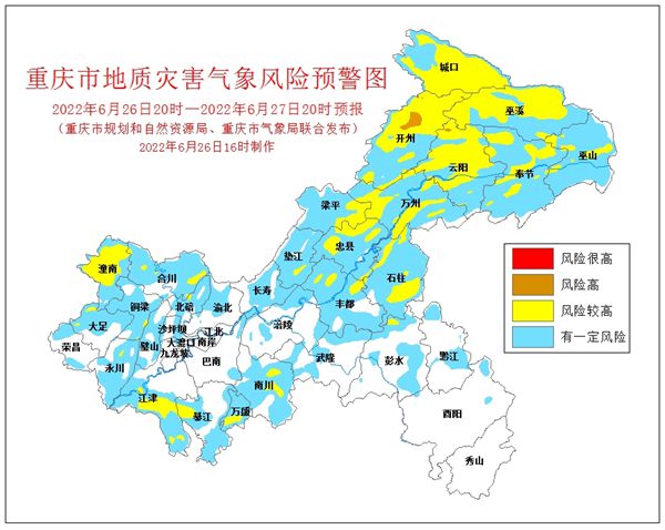 6月26日16時,重慶市規劃和自然資源局、重慶市氣象局聯合發布全市地質災害氣象風險預警。
