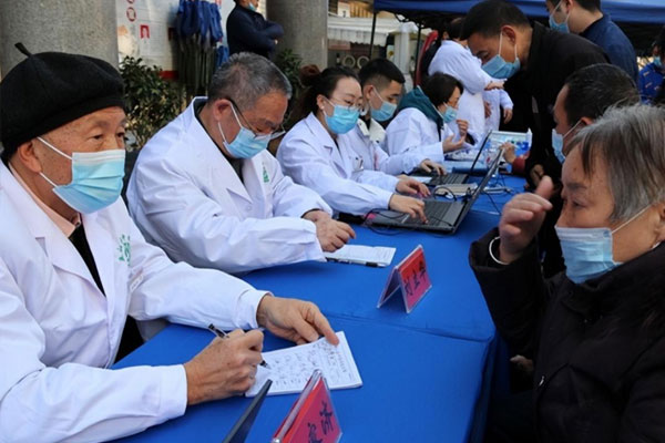 饒家濟(左一)為群眾提供義診服務。巫山縣中醫院供圖