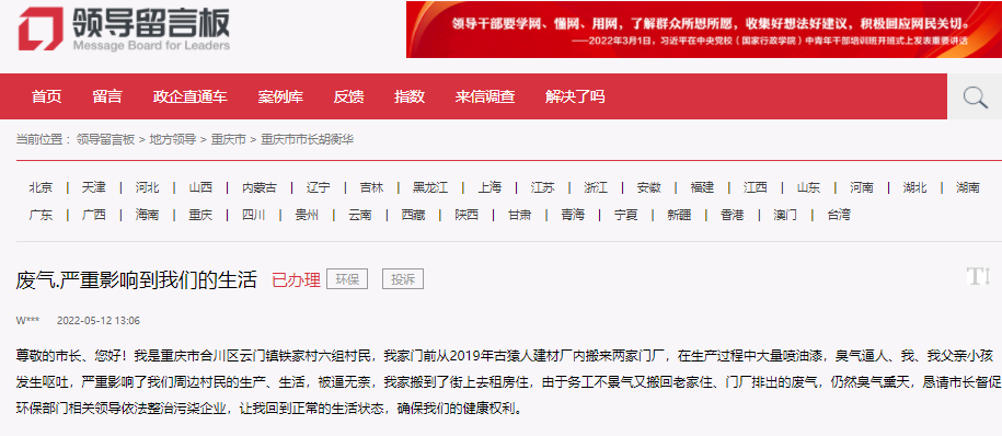 網友在留言中表示,其是合川區云門鎮鐵家村六組村民。“我家門前2019年從古猿人建材廠內搬來兩家門廠,在生產過程中大量噴油漆,臭氣逼人。嚴重影響了我們周邊村民的生產、生活。”該網友稱,因異味擾民,一家人搬到了街上去租房住了一段時間,搬回老家后,發現門廠排出的廢氣,仍然臭氣熏天。“懇請市長督促環保部門依法整治污染企業,讓我回到正常的生活狀態,確保我們的健康權利。”