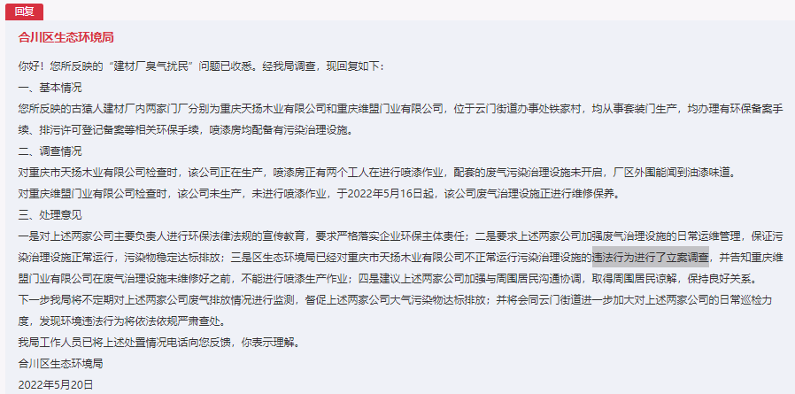 合川區生態環境局在回復中表示,已對兩家公司主要負責人進行了環保法律法規的宣傳教育,要求嚴格落實企業環保主體責任;加強廢氣治理設施的日常運維管理,保證污染治理設施正常運行,污染物穩定達標排放。
