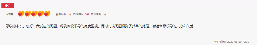 “謝謝各級領導的關心和關愛,我反映的廢氣排放問題已得到妥善處理。”針對合川區生態環境局的回復及處理,留言群眾也通過人民網“領導留言板”給出了五“心”好評,即解決程度、辦理態度、辦理速度均為最高分5分。