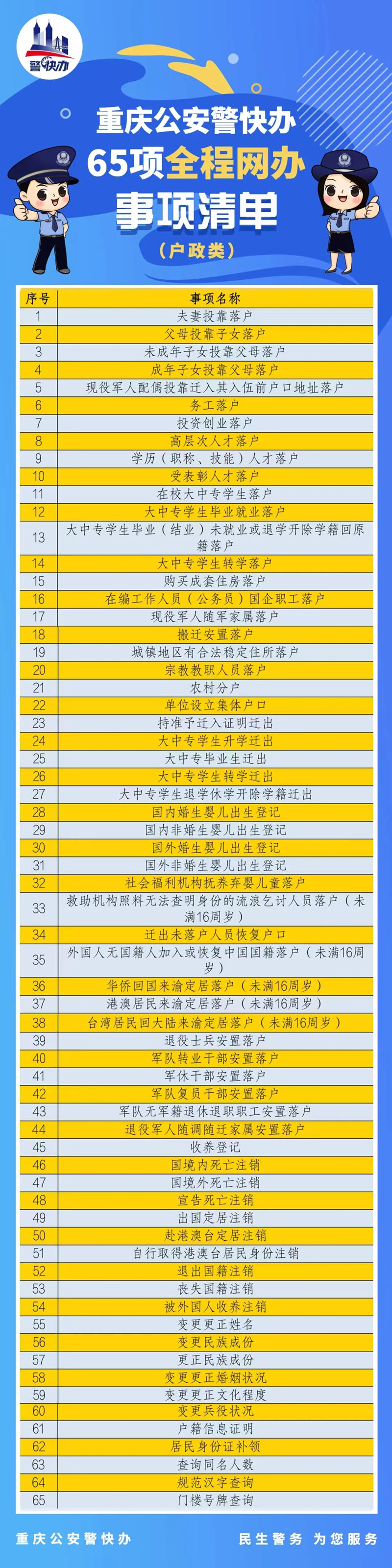 人民網重慶7月12日電 (劉政寧)7月11日,重慶市公安局治安管理總隊發布消息稱,今后,市民辦理戶籍遷移、戶口登記、戶口注銷、戶口登記信息變更等65項具體事項,不用出門即可“全程網辦”,只需通過手機登錄重慶市公安局“警快辦”平臺,即可申請辦理相關業務。