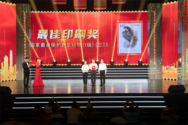 頒獎現場,5套郵票從全國眾多優秀作品中脫穎而出,《中國共產黨成立100周年》《江山如此多嬌》《五牛圖》《<生物多樣性公約>第十五次締約方大會》《國家重點保護野生動物(I級)(三)》五套郵票分獲最佳郵票獎、優秀郵票獎(2套)、最佳設計獎和最佳印刷獎。