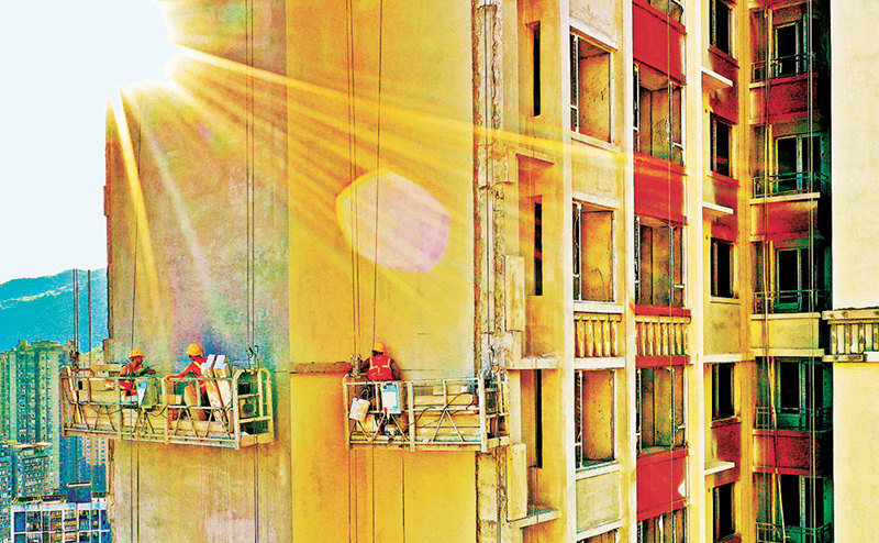 8月11日傍晚,萬盛經開區一項目現場,工人在落日的映照下進行外墻施工。