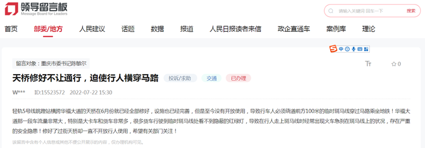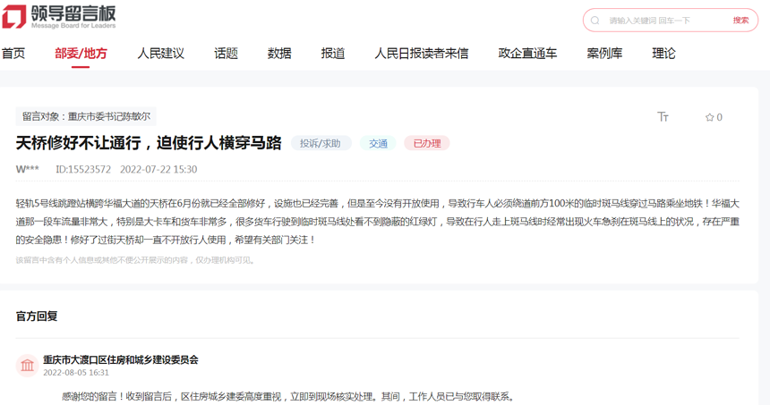 原來,2022年7月22日,該網友通過“領導留言板”向重慶市委書記陳敏爾反映,位于大渡口區輕軌5號線跳蹬站橫跨華福大道的天橋在6月份就已經全部修好,設施也已經完善,但至今沒有開放使用,導致行人必須繞道前方100米的臨時斑馬線穿過馬路乘坐地鐵。