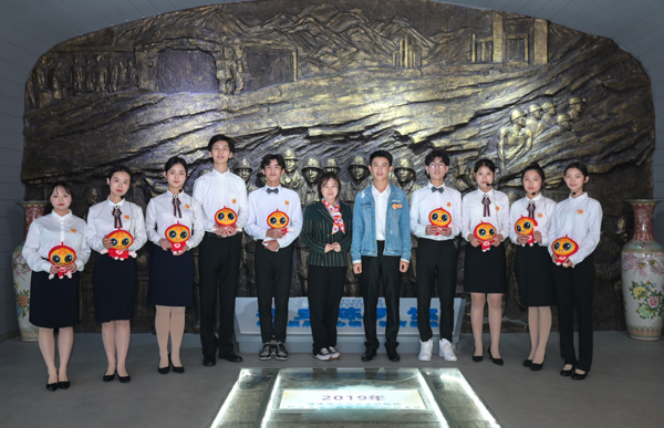 劉洪梅(中)和學生新聞中心校史館解說團成員合影。重慶工程職院供圖